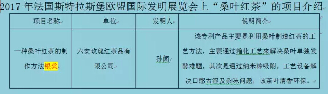 北京时间2017年9月11日晚8点半,在法国斯特拉斯堡举办的第116届国际发明展览会(列宾竞赛)的颁奖会上,六安玫瑰红茶品有限公司作为中国发明展团的一员,选送的“一种桑叶红茶的制作方法”发明项目荣获银奖,其发明创意、技术含量令人印象深刻,“桑叶红茶”降血糖、通便秘、抑制动脉硬化等功效也得到国际专家的一致好评。