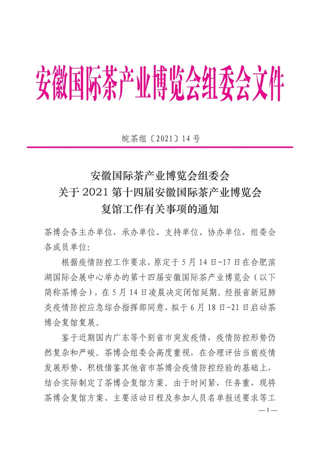 重磅||关于安徽茶博会复馆工作有关事项的通知